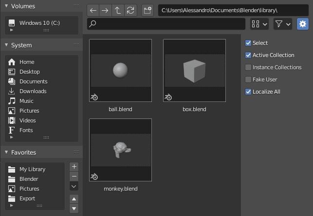 A library, on the other hand, is something similar to what I would see in my Windows Explorer folder tree. It is a storage space on disk with files grouped into props, figures, materials, poses and so on. I can scan through these files and pick what I want to include in a scene from the relevant category of content. Exactly how does this work in Blender?