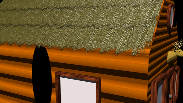 - I applied the "normals" map to the bump channel of the object used as the roof. I experimented with planes, cubes, etc. I tiled the normals map seamlessly in order to make the strands narrower. I also added the normals map as the driver of the gradient for the color channel in the shader tree for the roof. I made sure the number of tiles matched in the bump channel and the color channel.