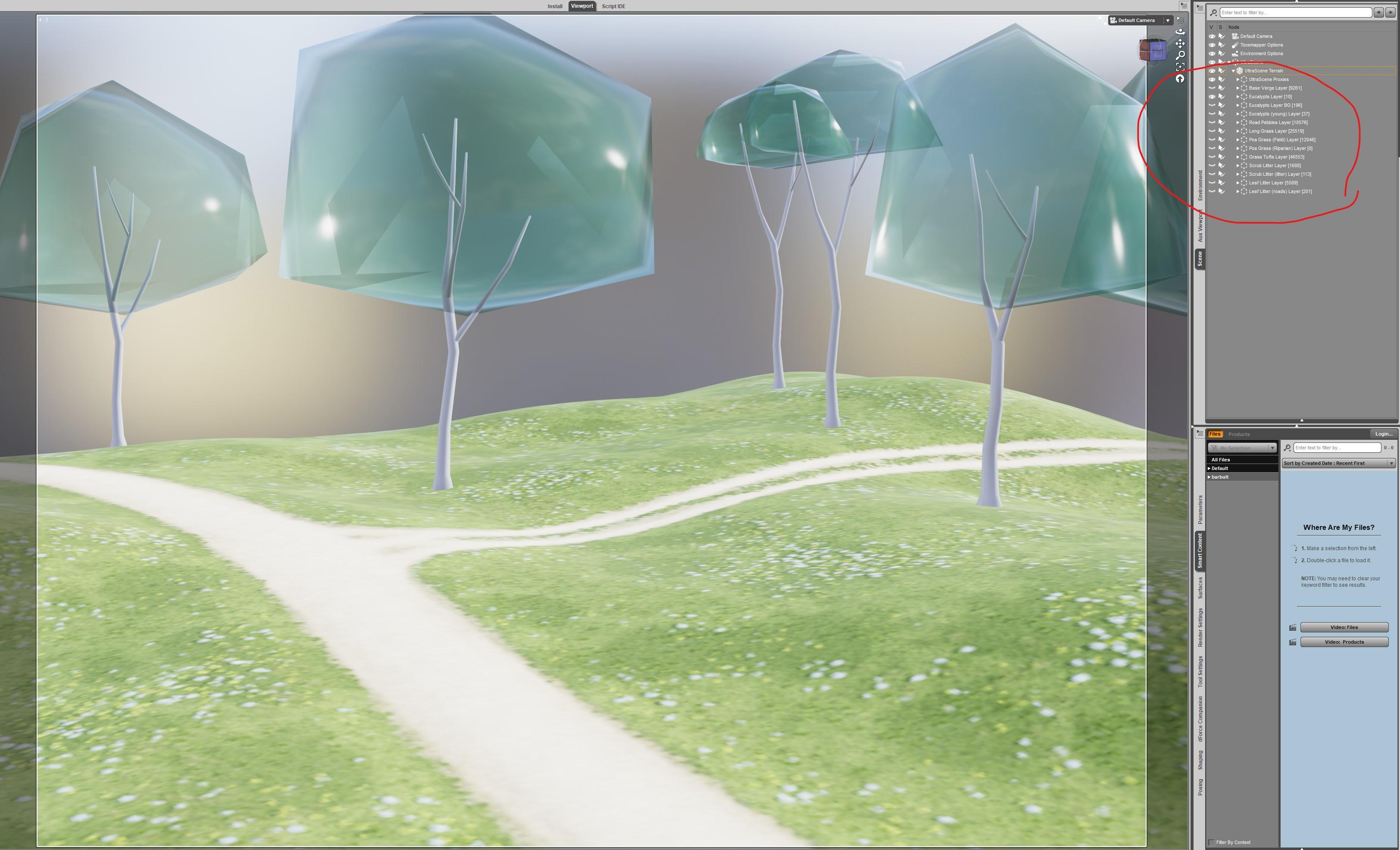 For @Gogger "Bubble Trees" rendered in Iray. They are not as bubbly as the Filament look, but this is the best I could do in the time available. smiley It is just a surface setting modification of the proxy materials. I made the proxies visible in render and the instances not visible in render.