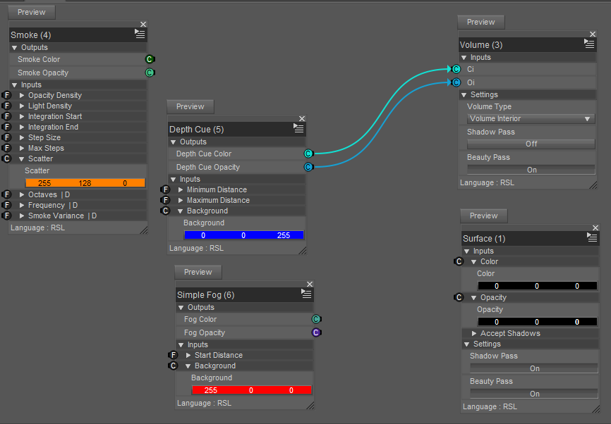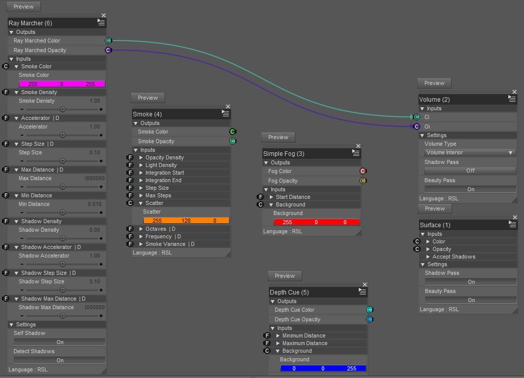Just a Surface brick, nothing about a DAZ Default Material that's usually plugged into a Surface brick. So I deleted it. Here's the resulting network (all three volume-driving bricks are shown, although only one is used at a time)