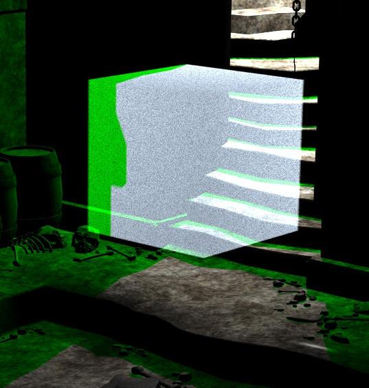 Left to rignt below - Simple Fog, Smoke, and Depth Cue. The green is the Shadow Colour of the DS point light. The front face of the cube cuts through the fallen pillar bottom left of the renders.