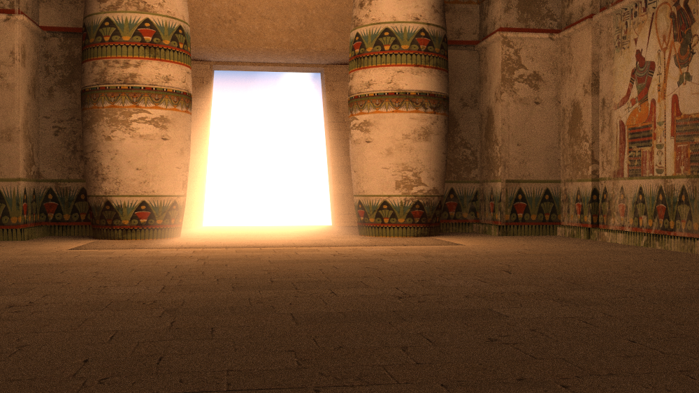Here I used a single distant (sun)light, a volume cube and an indirect light camera for ambient light. Got a bit of grain on the floor, upping the indirect light samples to 128 would probably fix that. And the indirect light intensity is probably a tad over the top, keeping it at the default 1 would have been more physically plausible.