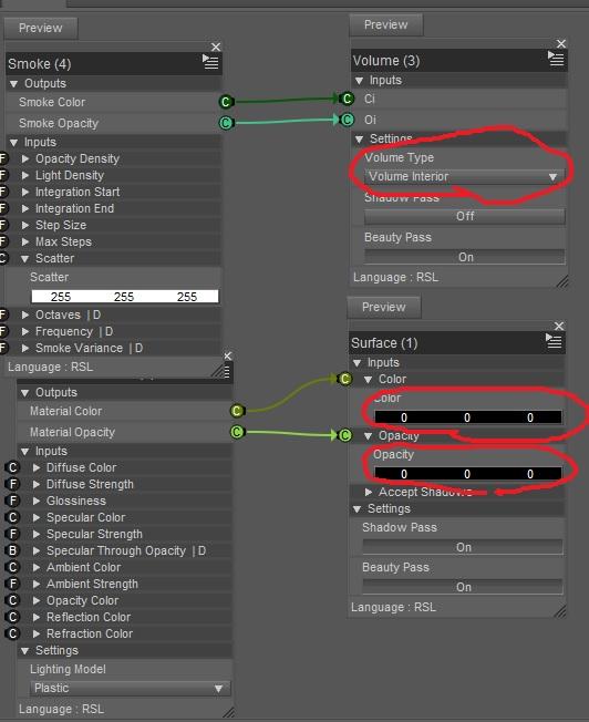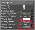 One thing springs to mind regarding the Poser atmosphere - it was very sensitive to certain parameters, and it was only because of a thread by Connatic over on Renderosity (i'll try to find the link) that I eventually got values that actually caused the atmosphere to do something noticeable. I've circled them in the screenshot below. I'm guessing that perhaps the Smoke / Ray Marcher bricks may be similarly sensitive, and you need just the right combination of values to actually see any atmospheric effect ? They both have density and step size parameters, so I assume they work in a similar manner to the Poser atmosphere. But if so what are a good set of values to start with ? Random guesses aren't the best way, as I learnt when I was first trying the Poser atmosphere !
