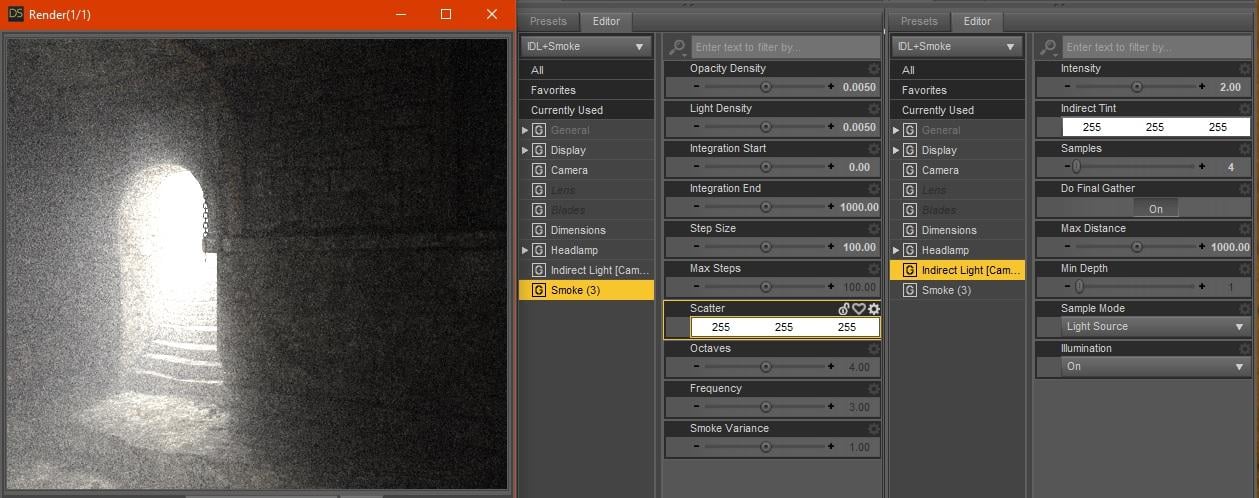 And if I create a camera with both Smoke and Indirect Light and use the sttings I had before which gave me quick renders, I get this rather grainy result, but it's definitely working nicely.