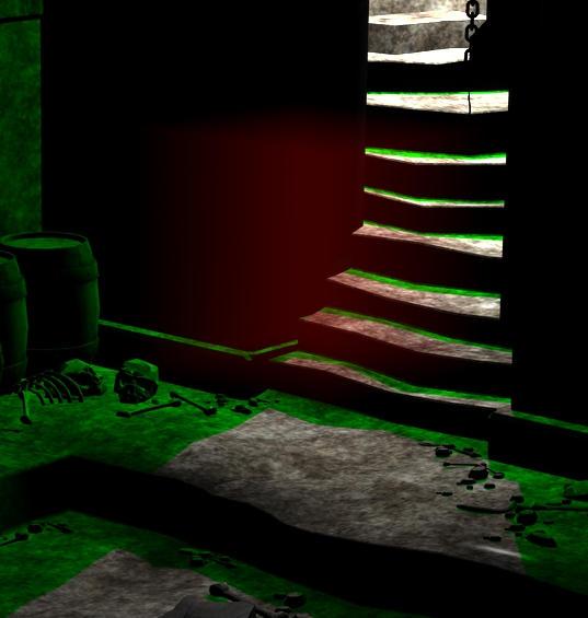 First I tried expanding the cube so both camera, light and scene were inside it. So the cubes just an ordinary box and everythings inside it. Here's the render - as expected. Green is the Shadow Color of the DS point light.