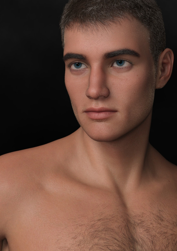 MIchiael 8.1 with his own skin.  Tear  line added, iris depth added. Aged up about 25-30%. Carlos Hair and Dain facial scruff added.  Totally default lighting