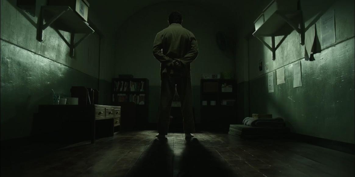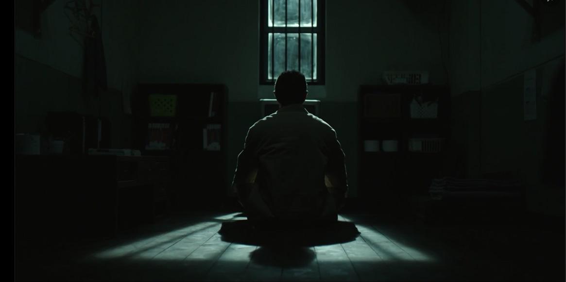 This is an example from "Feel Good to Die" of using the wall as a leading line to draw our eyes to the figure. The smaller the character is showin in the frame, the "smaller" (worthless, alone, isolated, frustrated, etc) he/she feels.