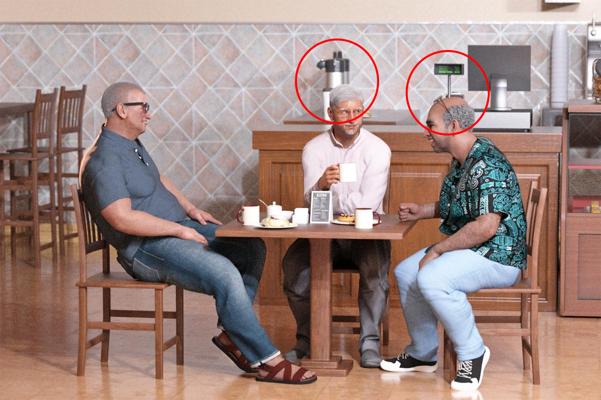Now that it was pointed out I can't unsee the objects sticking out of the heads.  It's making me cringe a bit.  Interestingly, a week or so ago I posted an image of a guy in the park and the first thing I saw was a tree coming out the top of his head.  Moved that tree out of the way really quick.