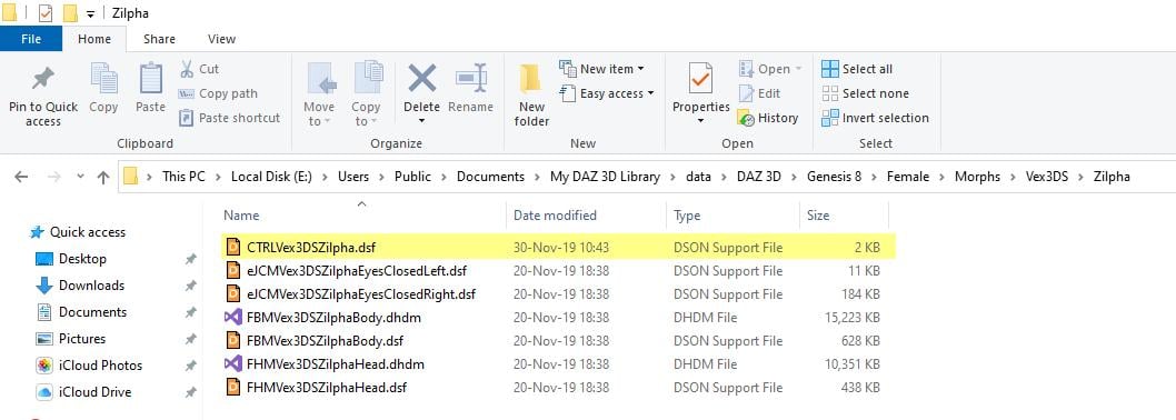 Step 1 - Locate the file name CTRLVex3DSZilpha.dsf, it should be located in the folder C:\Users\Public\Documents\My DAZ 3D Library\data\DAZ 3D\Genesis 8\Female\Morphs\Vex3DS\Zilpha, if you have your content loaded in the default location on your C drive.