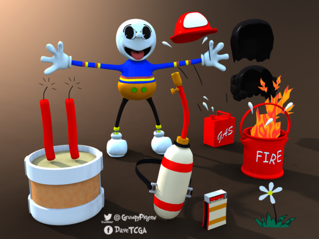 there's a Flamin' Carrarian character boned and morphed and texture zones, 2 hair pieces, a helmet, glasses, bucket, gas can, fire extinguisher, matchbox, drum kit, flower and some splashes and stuff..
