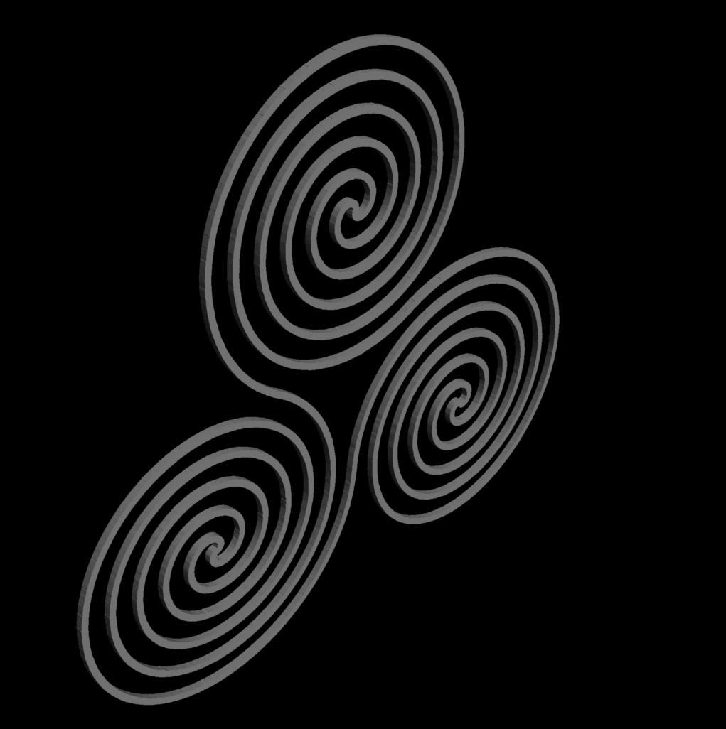 The triquetre as clumsily modelled in the model room. The triple spiral you can take into the model room, select all and then Model>add thickness