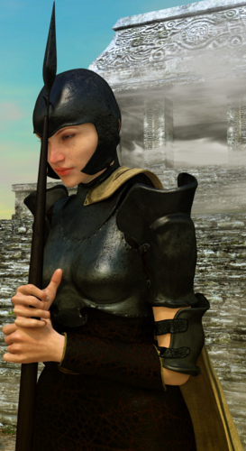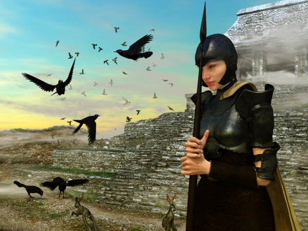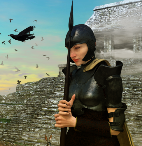 Philemo, beautiful image. The pose is a bit stiff (though probably not important for this challenge), especially the hands - I understand she should be tired, but that would probably mean she'd lean on the spear more and grab it tighter, not the opposite... The sky is gorgeous! So is the fog and the animals. Love the skin on the figure, too.