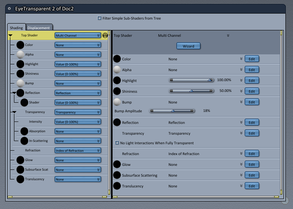 The Hurdy Gurdy Man eye color map has a burned in reflection. This doesn’t work with the scene lighting and detracts from the realism in the eye. I removed it in photoshop with the clone and smudge tools. I made a new bump map from this color map as well in Filter Forge. The iris/eyeball/pupil eye domains all have the same shader applied. There are no settings for highlights and shininess in the inner eye. The highlights and shine are set in the EyeTransparent domain shader, pretty much following the setup by PhilW in his tutorial for a human figure. Transparency is 100% and the refraction index is 1%=water.
