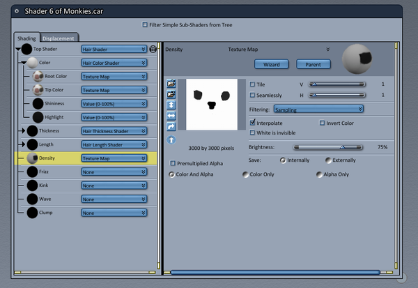 Continued...I applied the dynamic hair to the monkey model, selecting the UV based option. I set up separate hair domains for the body, head, head tranfur, and tail since I wanted to be able to give them different hair densities. All hair groups have the same general settings of length, thickness, and mode. Originally the scaling was 2%, but this made the monkey look like a prickly cactus, so I set it to 1%. The body fur seems a little thin, so I might bump up the scaling. The body hair count is 60K, head 40K, head transfur 10K, and tail 40K. I didn’t do too much styling other than brushing it out with symmetry on and used the popup tool at 0.01 inches. I made 2 hair shader domains one for body and tail and the other for the head. The monkey’s color map is placed in the root and tip color channels so the fur follows the figure’s markings. The paws have dark black on the color map, which needs some adjustment. Highlight and shininess are pretty much off in this render, so the fur looks a little dull. The hair thickness is set at 100% for the root and 30% for the tip, but it looks a little too blunt ended, so I might adjust the tip % down it for a more pointed look. I didn’t want much hair on the face and ears, so I made a density map from figure UV map in photoshop with black where I don’t want any hair. The brightness is set to 75% to let a few hairs through.