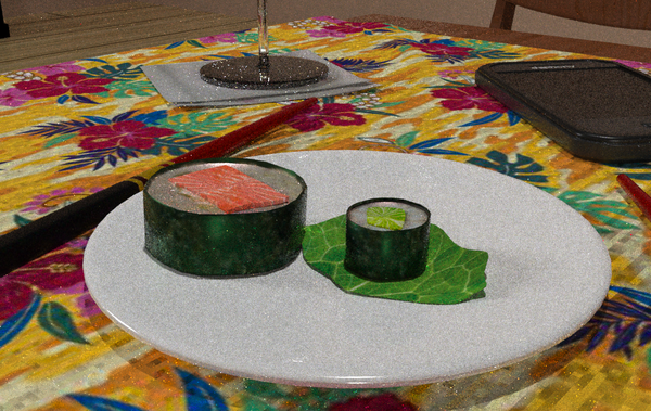 I duplicated the sushi rolls, deleted the tops to one set and the sides to the other sets. It allowed me to lower the tops to give the edges depth. What I did was add vertex objects to it, a lettuce and fish textured ones, plus I added an opal type surface to the top sushi texture. This render is a quick lux render test.