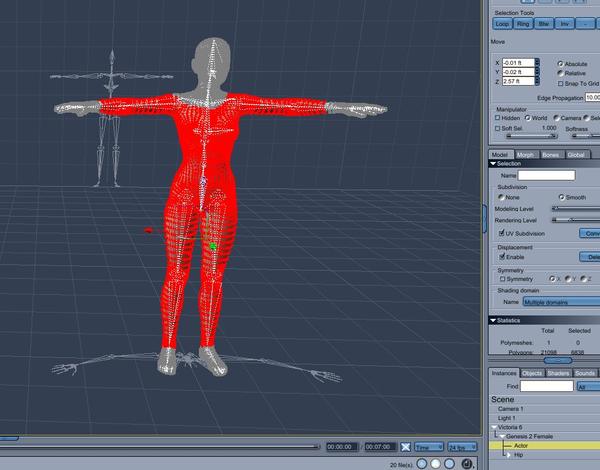 - Judging by the screenshots, it appears your character has long sleeves and long pants. You really only need the G2F head, neck, hands, and feet. You could create a new shading domain on the G2F and make it invisible. In the attached screenshots, I highlighted the actor level of G2F, entered the vertex modeler, and used the lasso tool to select the central body and limbs. Creating a new shading domain and adjusting the alpha leaves only the head, hands, and feet, which should work for you.