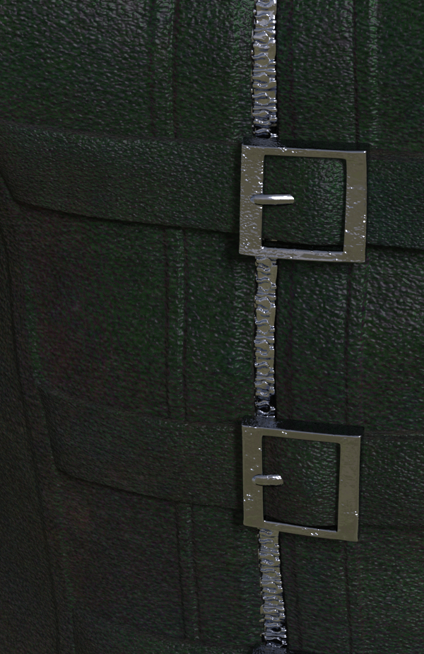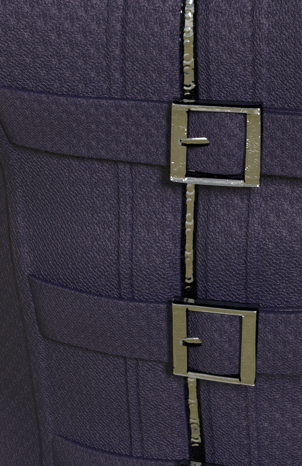 The Rocker Choker needs its (iray-optimised) bump map dialed down even further. The Delta Corset default textures also need to be looked at and probably completely swapped for tiled maps - I want it to look like leather. It wasn't probably intended to.