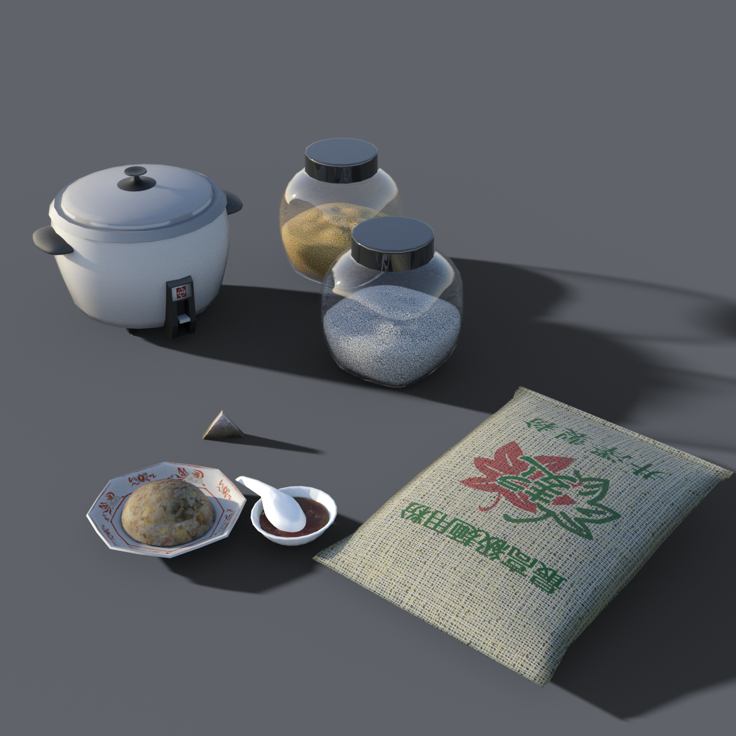 The rice situation here is pretty dire. I usually slap a rice texture on mashed potatoes or something if I want a little rice pile. That said, there are some resources. Most of this comes from https://www.daz3d.com/rairaiken-shinjuku-1954 and https://www.daz3d.com/yamachan-ramen-1961-food-truck. https://www.daz3d.com/old-japanese-soba-diner also has rice, I think. You may need to mess with the textures. The rice containers came from Harwood House.