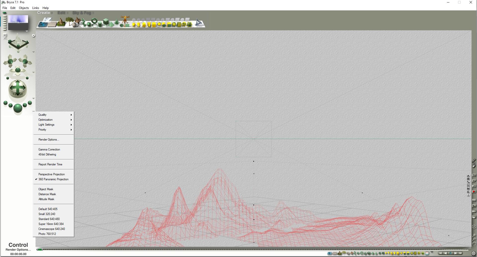 - Bryce has a 360 projection render option found along the left side triangle next to the render balls