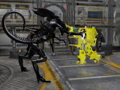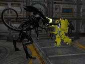 Bunyip, the setup looks very good for Aliens, especially the environment and reflection off the alien. However, it was hard for me to see the Ripley character. In the movie screenshot you provided, her face was lit by a cockpit light in the suit. Also, not sure what you are going for, but more reflection or shininess on the robot suit might make it pop a little more. It kind of blends into the background.