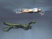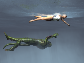 Three guesses for which movie this is related to. The water surface is a terrain. I played with different reflection, refraction, and transparency settings for the water shader. I may add some plants or similar but this is the basic shot. Postwork with Ron's splashes available in the daz store. I used Carara fog to get the underwater cloudy streaks around the creature.