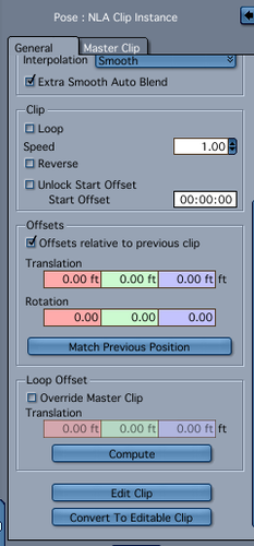 Just another little tidbit to share regarding NLA clips. If you use IK tracking, it will over-ride the clip.