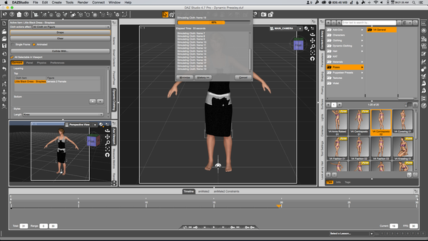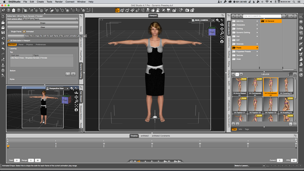 That being said, it's not hard to use dynamic cloth on any model really. Since it's dynamic, you just need to start with the basic V4 pose or you can simply enlarge the dynamic cloth before hitting drape. Then drape the item in a single frame. Then, move the animation head to the 30th frame, change the pose of the model, not the dynamic cloth, then move the head back to frame 1 and then drape the item in animation. Once it's done, move the animation head to frame 30 and render just that frame.
