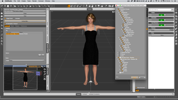 3) I clicked 'Collide with...' and deselected G2F's hands and head and deselected the Hair, Top and Shorts. Since the shorts are for modesty purposes only, I won't need them in the final render, so no need to collide with them. You could though, but you'd need to scale the Little Black Dress to 110% to get it outside the items. It does work though. You will also notice that I have it set to 'Single Frame' in the Dynamic Clothing Panel. This is important as we'll change that later. example03.png