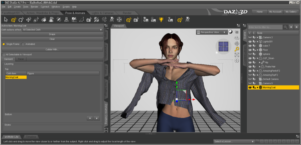 For clarification sake, I learned most of these techniques off of YouTube. Someone, can't remember who at the moment, posted a video of how to drape V4 clothing on a Genesis 2 Female and I've basically used that format for the animation portion. I did add the single frame drape first and that helped even more.