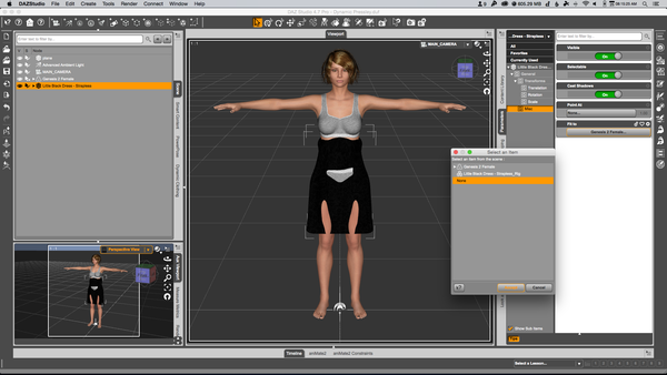 2) I reselected 'Fit to' and choose None. This is necessary for the Dynamic Clothing to understand that I want to drape the dress on the G2F model. If I leave it 'fitted' it will never work well. If I don't fit it and then unfit it, then it will basically just drop to the floor. example02.png