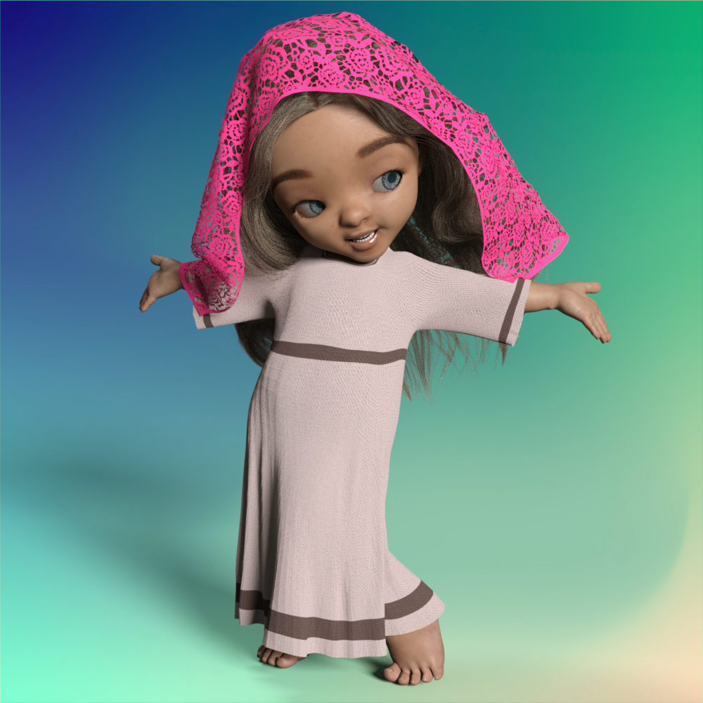 7. The gown and the head scarf can be simulated using dForce ... select the item, add a dForce modifier, have Bugga Boo at the 30 mark, use the timeline for the simulation, let it work from the default position to the new pose. Do NOT freak out about mid-point when the gown might look real goofy WHEN simulating the head scarf. By 30 all should be well ;-)