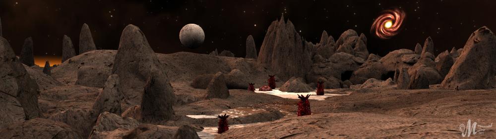 I found this beautiful Alien Landscape at ShareCG, the lighting is from Exotic Hdri for Fantasy Skies and Sci-Fi, and the galaxy and planet from the Space Construction Kit.