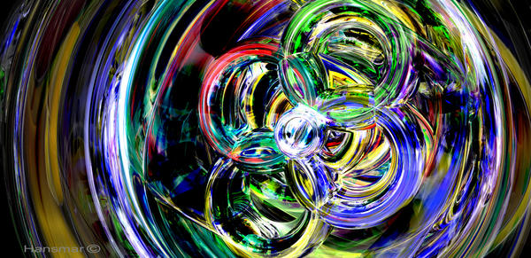 With my abstract set up (see earlier) I made a couple of new images: one at Renderosity, and one at DeviantArt (there with the balls modified into torusses). I now add the fourth one here: again with the torusses (except the outer border of my world, which is still a reflective ball). I modified the lights (more specular output) and the textures (some 'random' anisotropy', which you might not see in this render). And I positioned the camera to look into the torusses (or is it tori?). Strange effects and lots of chaotic colours!