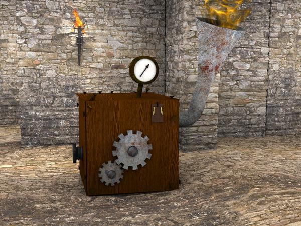 There is very little contrast as everything is being lit very evenly. You have torches, but in a very lit scene. Making the scene more realistically lit and allowing the torches to guide your lighting will add drama and contrast to your scene so that you can make out your cool contraption from everything else in the scene.