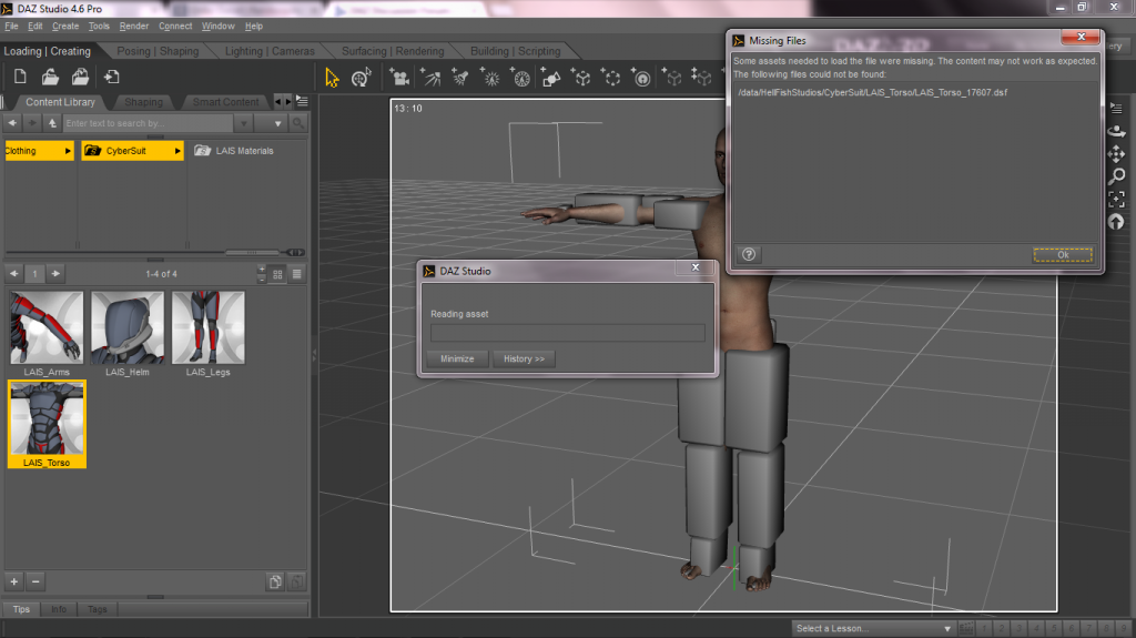 I know it's been a long time, regarding this subject. It's only because I gave up on this. But I'm willing to give it a shot again. I actually have 2 purchases from Dario fish. I've gotten the additional armor pieces to load which would be the LAIS armor. I just can't get the Cybersuit one to work. To go further with this has anyone had trouble figuring out how to properly install things downloaded from Renderosity. Is there a in depth tutorial on this type of stuff? Would someone be willing to walk me through this process step by step? I have a skype account. That may be the easiet way to do the walk through. Thanks guys, hope to here from you soon!