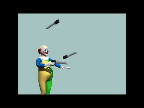 Created a simple loop of my clown juggling knives. I started by inserting a primitive sphere and applying physics. I gave the sphere a starting vertical Z axis speed and a slight starting X axis speed. This created an upward arc and to the side. I ran the physics simulation. I examined the path of the sphere and noted the position of the sphere at the peak of the arc. I returned to the beginning and inserted a second sphere and moved it to the location of the 1st sphere at the top of its arc. I applied physics to this second sphere, giving it the same X axis speed as the first sphere, but a 0 starting speed in the Z axis. I ran physics again. I noted the position of the second sphere when the 1st sphere reaches the top. Back at the beginning, I inserted a 3rd sphere. This sphere I keyframed. I started it at the location of the second sphere after it has fallen, and ended it at the starting location of the 1st sphere. For this 3rd sphere, I went to the middle frame and put in a keyframe of slight increase in Z axis. I reduced the total keyframes to just the length of time it takes the 1st sphere to get from its starting position to the top of its arc as calculated by the physics sim. Loop. Now when I play the looped sequence it looks like the balls are in a continuous loop with the upward and downward paths of the first two balls matching physics.