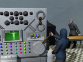 The bikini machine (machine of villainy) has a monitor next to the lever.  I UVMapped the monitor screen as a perfect square filling up the UVMap.  That way, one can render out an animation and apply it to the shader of the monitor and it will apply.  Best to use the same dimension as the monitor for the animation.