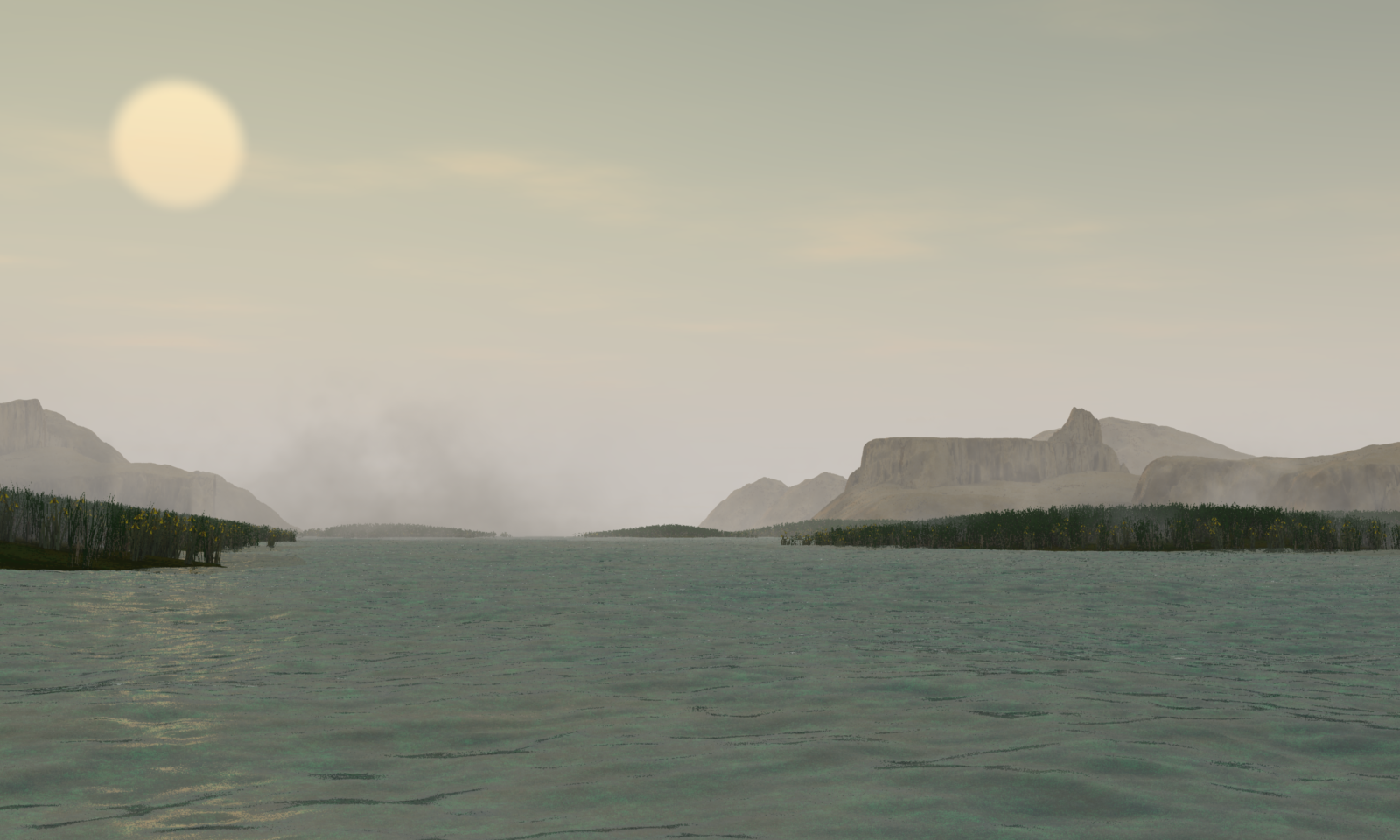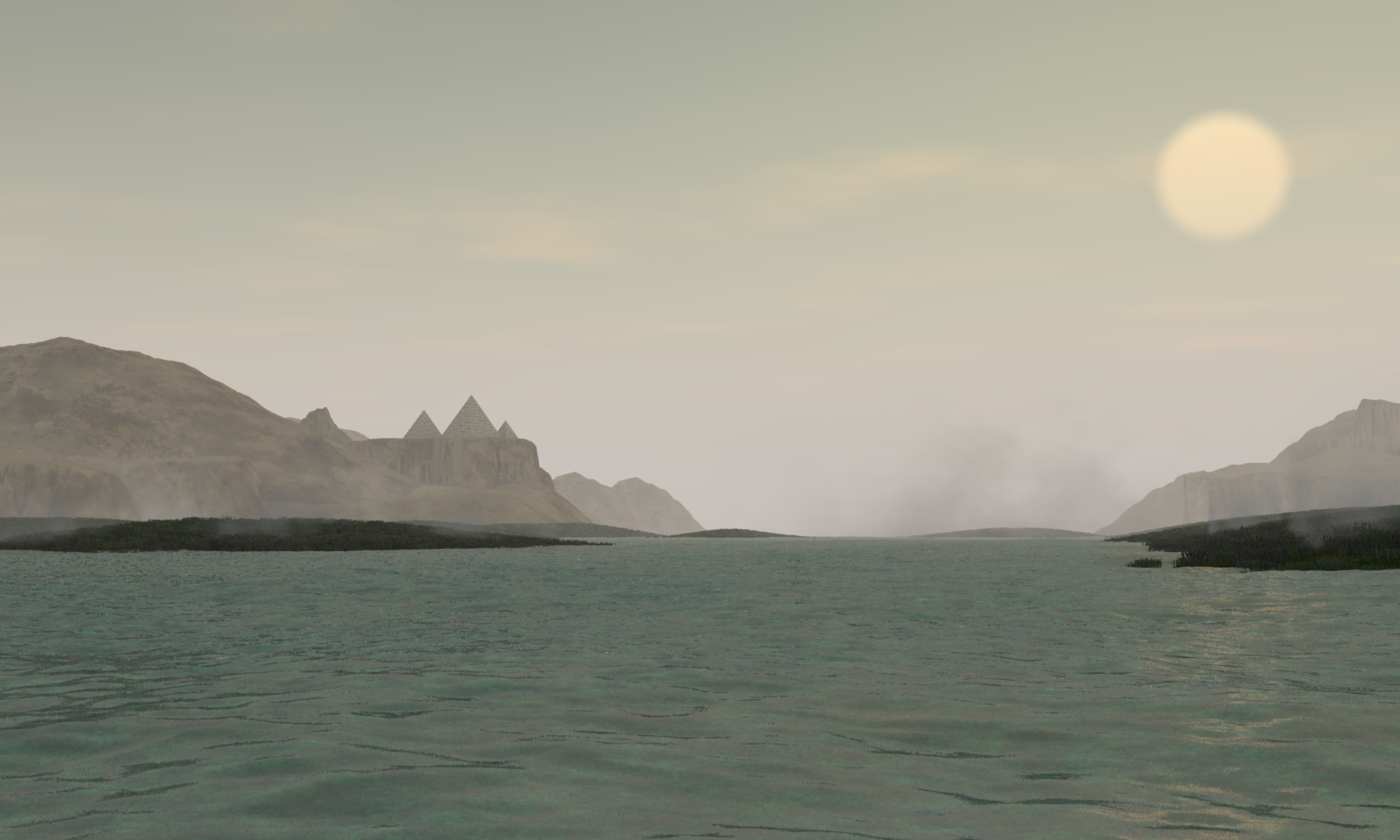 WIP. Back to some landscapes with reflections and clouds and replicators now that I am at my desktop again. Used an image editor for the main course of the river, which allowed me to use the same to create the distribution maps for replicators. The river water itself is the old trick of applying a water shader to a terrain and then replicating it with 'seamless' enabled. I tried to use a mixture of volumetric clouds and fog to get the haze. There is one patch darker than the rest that needs investigation and editing. I only used one or two grass models in the replicators for the WIP, so hopefully it will look better with more variety and an occasional palm tree or similar. Additional terrains are in the distance and along the sides to give the sense of a valley. One has a plateau filter for future pyramids. I did like the way the water has a line of reflection from the sun but I think the atmosphere in general could be greatly improved. Using the realistic sky editor general tools, not a preset at the moment.