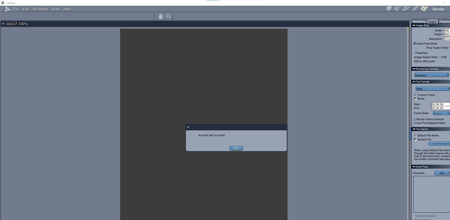 Turn off visibility of second foreground figure. Still mystery render error. Insert new camera. Still mystery render error. Point new camera away from scene at a simple static prop. Still mystery render error.
