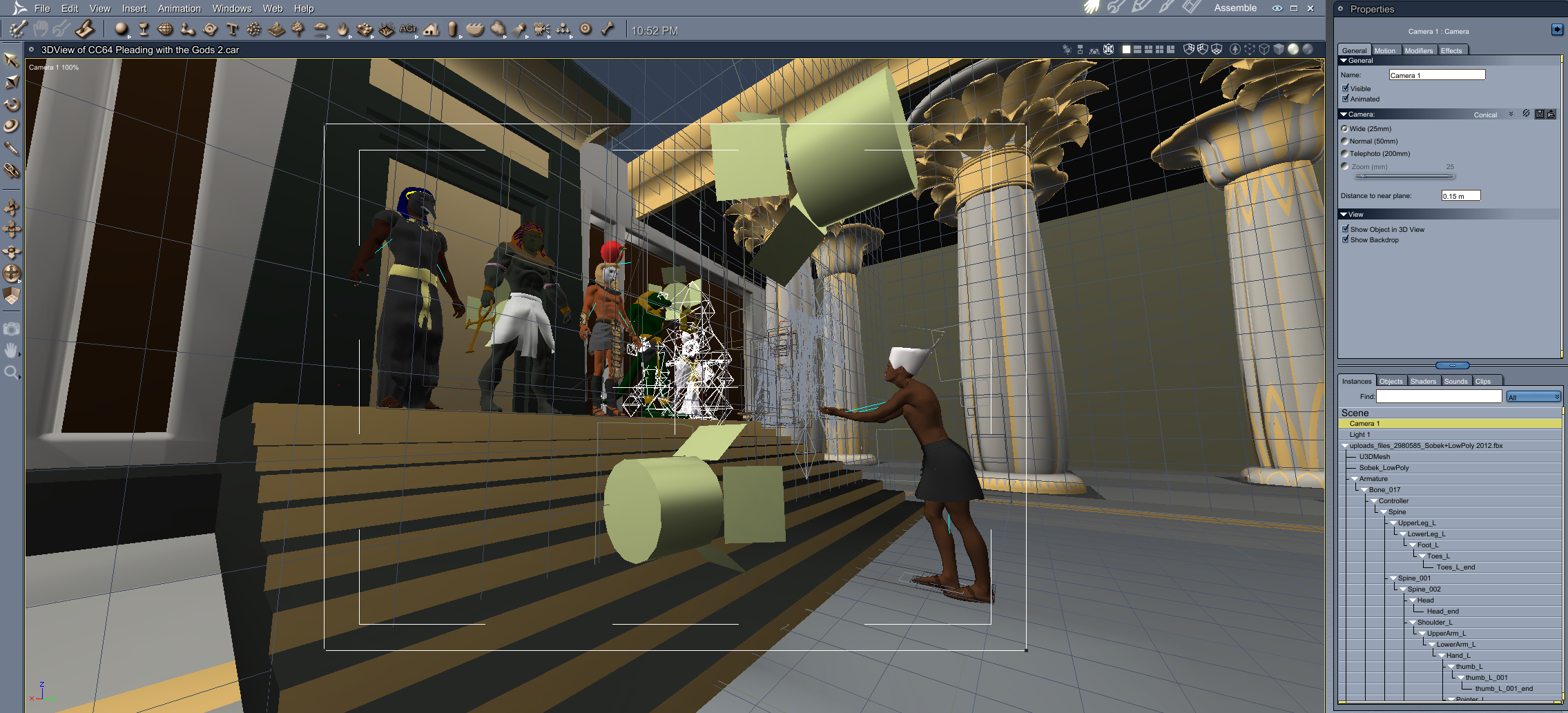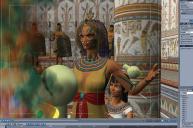 Setting up a basic dramatic secret-lovers-caught scene. Two figures in foreground with Egyptian architecture in background. Doorway to have figure catching the lovers. Simple, right? Step by step setting up the background, do some test renders, adjust shaders, repeat. Test renders fine. Add one foreground figure and adjust lighting and shaders. Test renders. Adjust camera. More test renders. Test renders fine. Add a second foreground figure and adjust. Test renders...