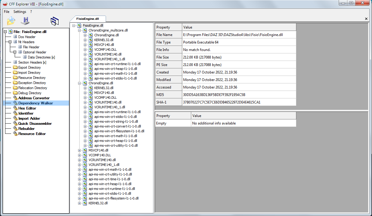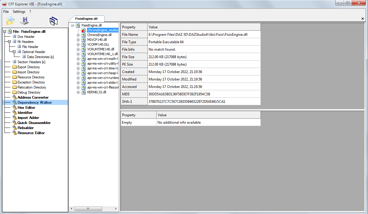 Click in Dependency Walker and expand ChronoEngine.dll and ChronoEngine_multicore.dll below FisioEngine.dll. You should see something like this: