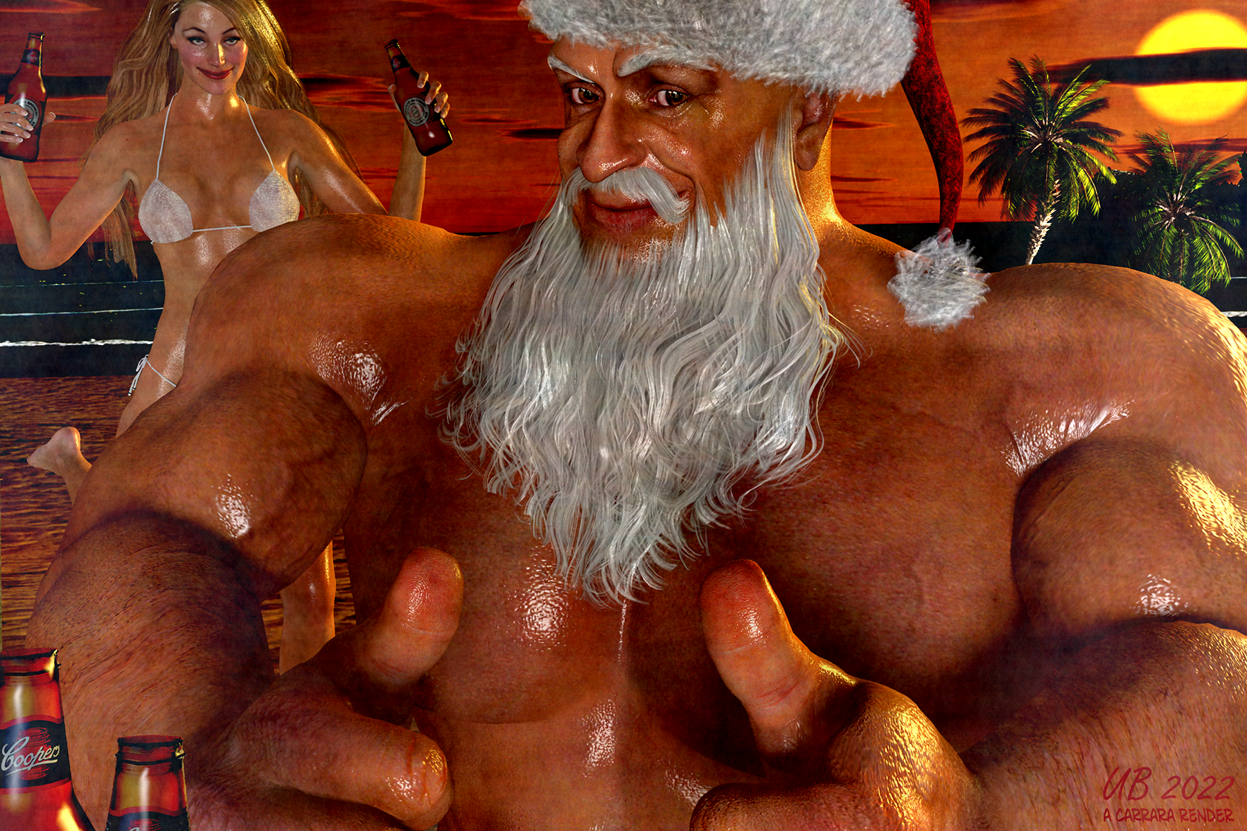 Went old-school, with Freak 3 and V3.  Carrara sun and realistic sky.  My Beach for the land and sea props.  Santa Beard for G3 again, but a different hat (Santa Baby).  And cutouts. :)