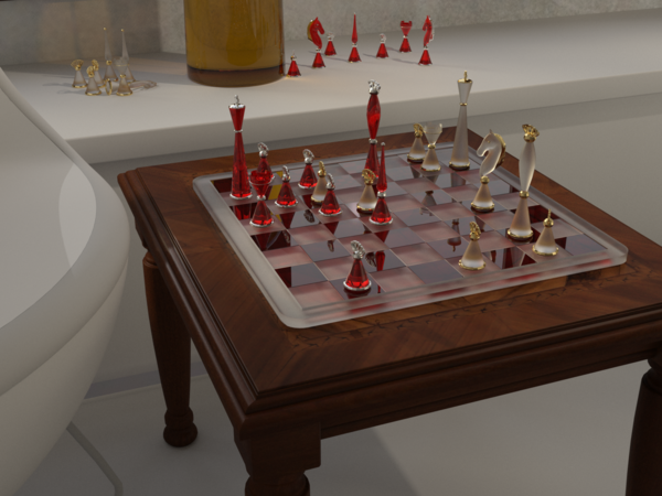 After spending a lot of time with skin and hair and other important details, I decided to do something just for fun last weekend. I bought the Glass Gambit Chess Set and set it up on a table from the Gentlemen's Game Room. I used the Iray glass and metal shaders: the White chessmen have clear solid frosted glass, as do the white squares and the board frame, and gold metal accents; the black chessman have solid light green glass applied with the transmit color changed to red, as do the black squares, and silver metal accents.