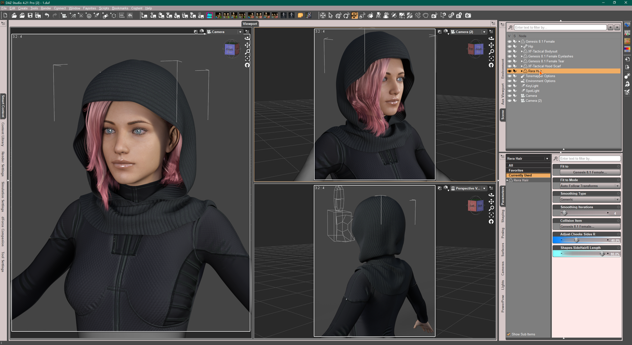 For this Rera Hair, a non-dforce one, I just roughly dialed some morphs of the hair and hood, gave them a couple of drags by using Mesh Grabber. (sometimes you need to grab and drag both of them) The hair could be well 'wrapped' into the hood. If some fine and messy hair are not easy to be selected, you may use Geometry editor to select them, even hide them.