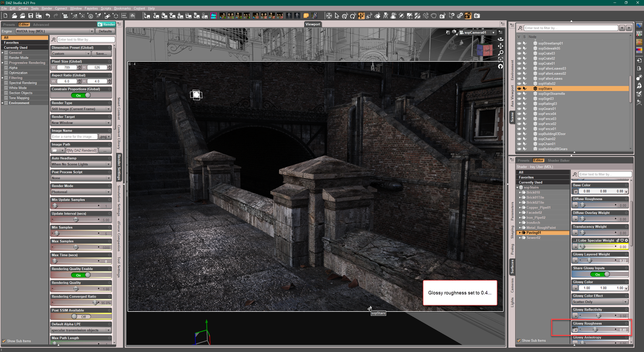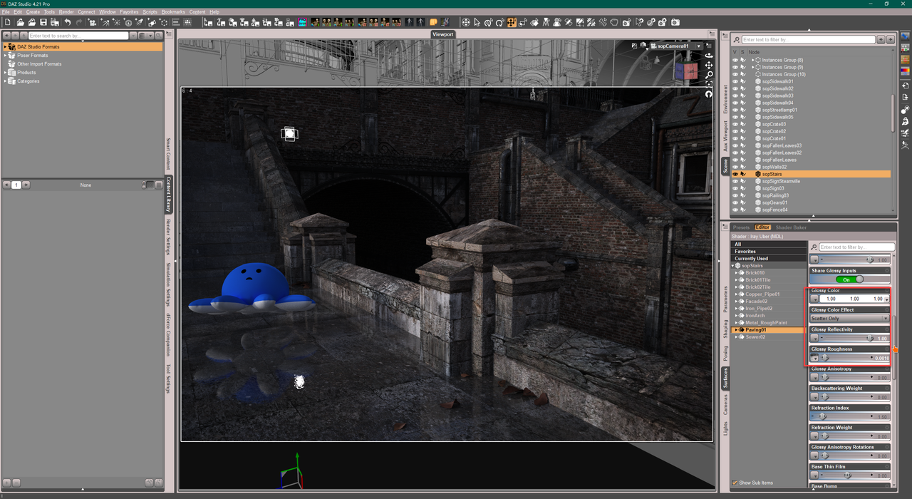 The principle and mechanism are all the same, not just in iray ~~ BTW, placing some puddles there might be even better ~