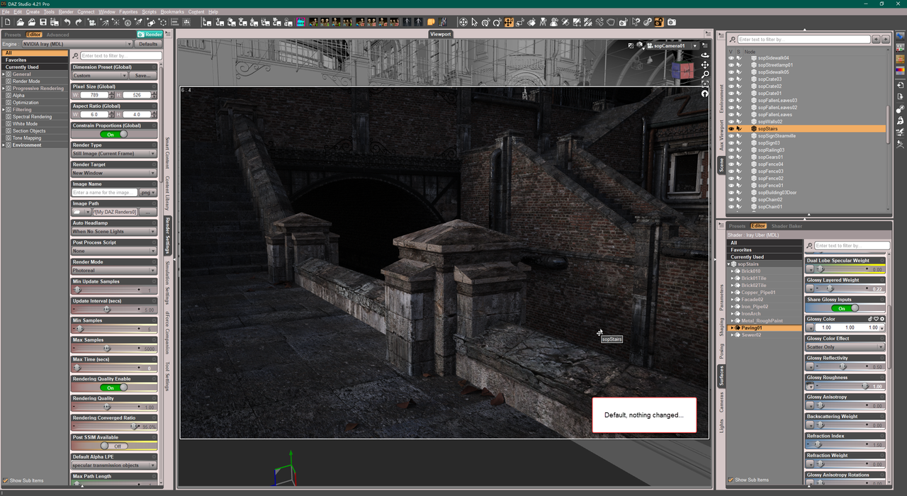 - Still,  should save Render Settings preset, Camera preset, and Material preset of  'sopStairs' (or a Shader preset of 'Paving01' surface of 'sopStairs').  Then apply them accordingly, the result should be the same...