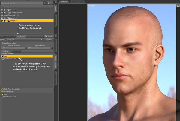 Did you know that you don't need an Nvidia GPU graphics card to render with Iray? It's true! As long as you have a decent CPU, as most modern PCs do, you can work with Iray while waiting for that drool-worthy GPU upgrade your tax refund has been allocated for (Yes Wolfie, I'm lookin' to ya ;-) )