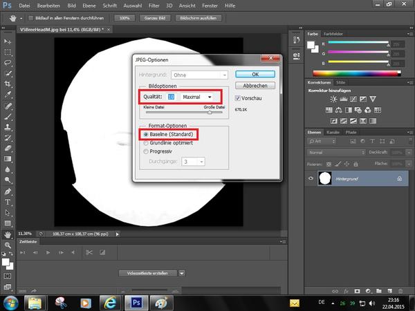 5. Choosing JPEG Options "Quality: 10" and "Baseline (Standard)".