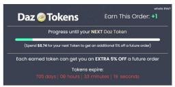 One token is earned for each $10 of purchase price (exept today one gets 2 for $10), and the tokens I used were earned with the first cart yesterday at 91% off for $81.65, 37 items, including a DO Pro bundle.
