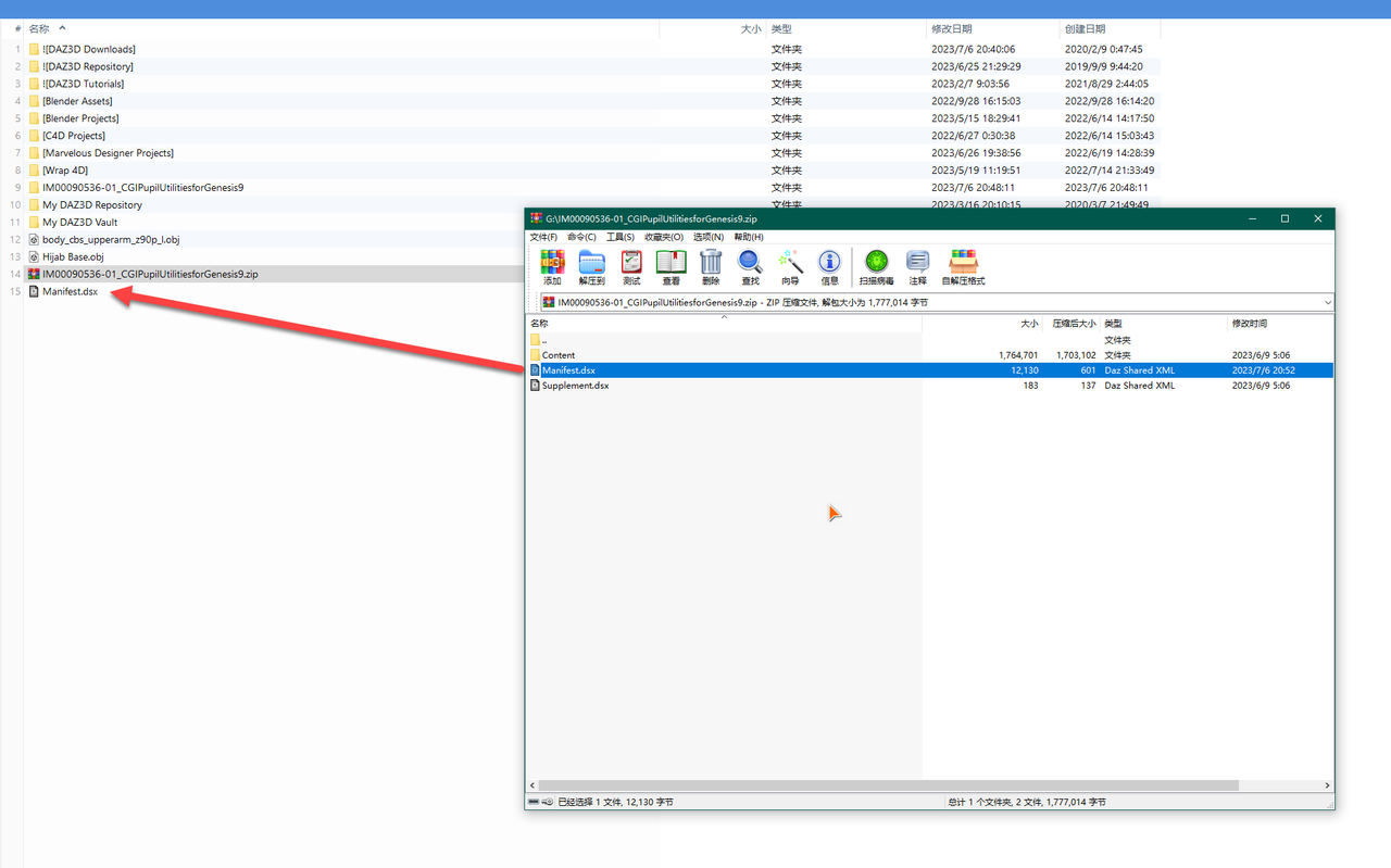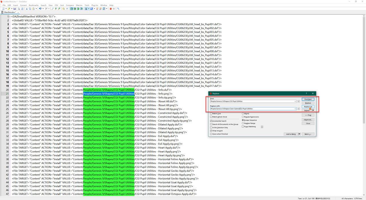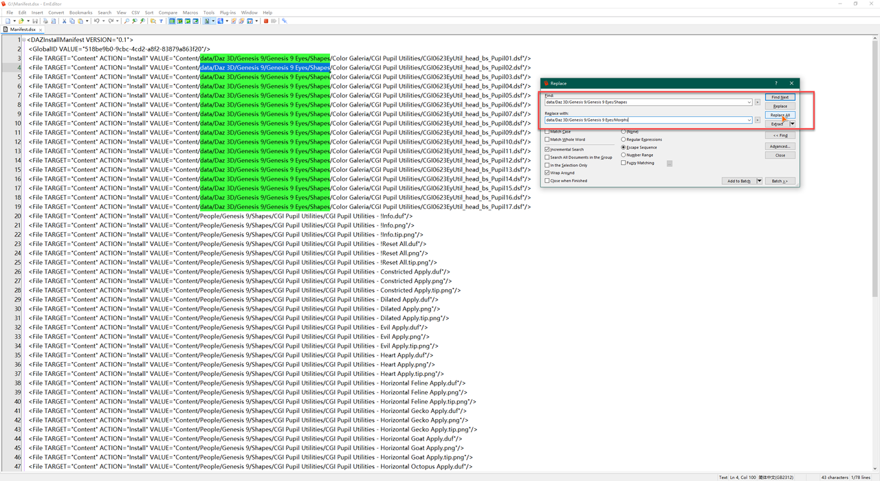 2 ) Open  Manifest.dsx with an Editor (EmEditor, Notepad++, etc.), replace "data/Daz 3D/Genesis 9/Genesis 9 Eyes/Shapes" with "data/Daz 3D/Genesis 9/Genesis 9 Eyes/Morphs" , then replace "People/Genesis 9/Shapes/CGI Pupil Utilities" with "People/Genesis 9/Shapes/Color Galeria/CGI Pupil Utilities". Save! Then drag Manifest.dsx back to IM00090536-01_CGIPupilUtilitiesforGenesis9.zip, and move the IM file to your Package Archive folder, overwrite.